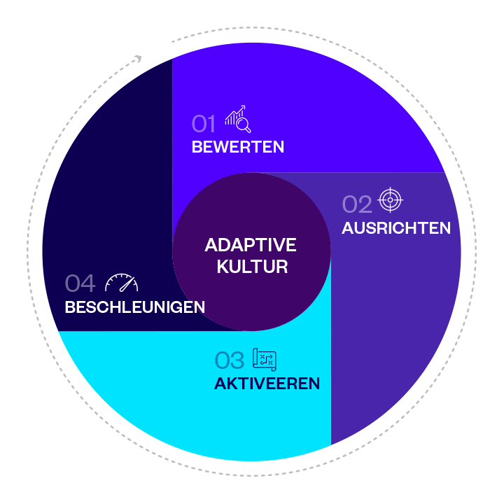 Um dauerhafte Veränderungen zu bewirken, beginnen Sie damit, Ihre aktuelle Situation zu bewerten, um einen Bezugswert festzulegen und Ihre Reise auf die gewünschten Ergebnisse auszurichten. Dann definieren Sie Ihren Unternehmenszweck, Ihre Strategie und Ihre Kultur, und richten diese aus, um diese Ergebnisse zu erreichen. Mit der Ausrichtung sind Sie bereit, Ihre Organisation zu aktivieren und sie mit den nötigen Mitteln auszustatten, um schnelleren Fortschritt zu erzielen. Der iterative Prozess kehrt zur Bewertung zurück, um bei Bedarf Anpassungen vorzunehmen und kontinuierliche Verbesserungen, bessere Geschäftsergebnisse und Nachhaltigkeit zu erzielen.