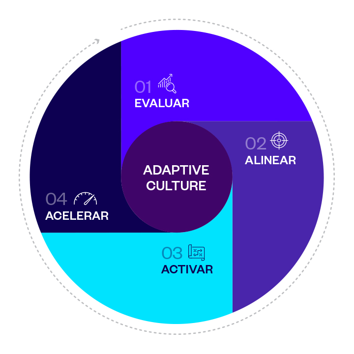Para lograr un cambio duradero, empezará por evaluar su situación actual para establecer un punto de referencia y centrar su viaje en los resultados deseados. A continuación, definirá y alineará su propósito, estrategia y cultura para lograr esos resultados. Una vez alineados, estará listo para activar y equipar a su organización para lograr y acelerar el progreso. El proceso iterativo vuelve a la evaluación para pivotar donde sea necesario e impulsar la mejora continua, mejores resultados empresariales y sostenibilidad.