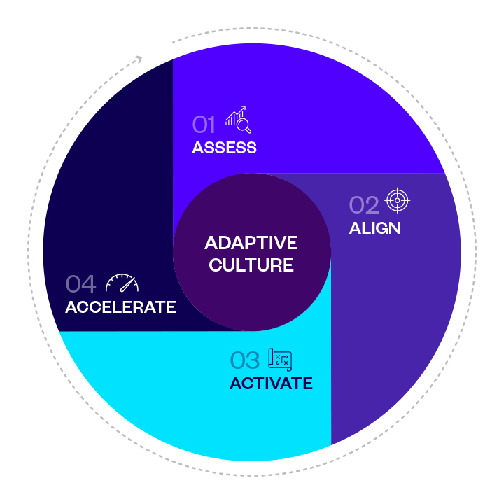 To make lasting change, you’ll start by assessing where you are now to establish a benchmark and focus your journey on desired results. Then you’ll define and align your purpose, strategy, and culture to achieve those results. With alignment, you’re ready to activate and equip your organization to make and accelerate progress. The iterative process returns to assessment to pivot where needed and drive continuous improvement, better business outcomes, and sustainability.